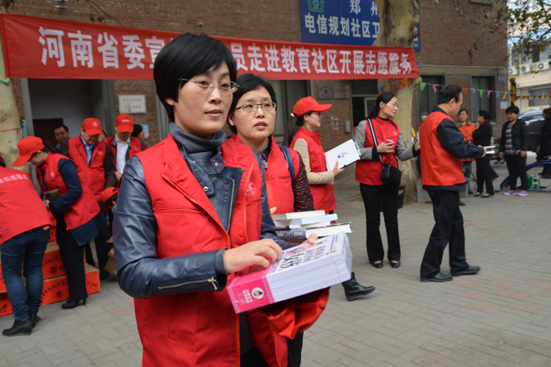 10月31日下午,一場精彩的小型文藝演出在鄭州市緯五路省教育社區(qū)舉行。演出期間,志愿者向現(xiàn)場觀看的居民免費贈送圖書、報紙和DVD。據(jù)了解,這是省委宣傳部開展的黨員志愿服務進社區(qū)活動。