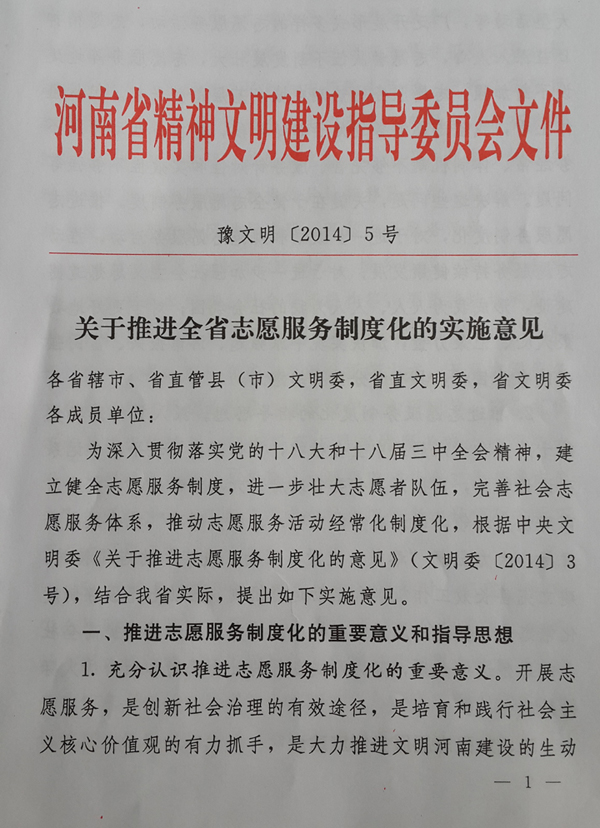1、充分認(rèn)識(shí)推進(jìn)志愿服務(wù)制度化的重要意義。開(kāi)展志愿服務(wù),是創(chuàng)新社會(huì)治理的有效途徑,是培育和踐行社會(huì)主義核心價(jià)值觀的有力抓手,是大力推進(jìn)文明河南建設(shè)的生動(dòng)實(shí)踐。近年來(lái),全省廣大志愿者圍繞扶危濟(jì)困、應(yīng)急救援、大型活動(dòng)等,廣泛開(kāi)展形式多樣的志愿服務(wù)活動(dòng),志愿精神日益深入人心,志愿者隊(duì)伍不斷發(fā)展壯大,志愿服務(wù)陣地建設(shè)不斷加強(qiáng),志愿服務(wù)的熱潮在城鄉(xiāng)基層蓬勃興起。但從整體上看,我省志愿服務(wù)還處于起始階段,存在著活動(dòng)開(kāi)展不夠經(jīng)常、體制機(jī)制不夠完善、服務(wù)針對(duì)性和實(shí)效性不夠強(qiáng)等問(wèn)題。解決這些問(wèn)題,關(guān)鍵在于健全志愿服務(wù)制度。推進(jìn)志愿服務(wù)制度化,對(duì)于進(jìn)一步鼓勵(lì)和規(guī)范志愿服務(wù)活動(dòng),推動(dòng)志愿服務(wù)持續(xù)健康發(fā)展;對(duì)于進(jìn)一步加強(qiáng)社會(huì)主義思想道德建設(shè),形成我為人人、人人為我的社會(huì)氛圍;對(duì)于更好地凝聚人心、匯聚力量,加快實(shí)現(xiàn)中原崛起、河南振興、富民強(qiáng)省的奮斗目標(biāo),具有十分重要的意義。
